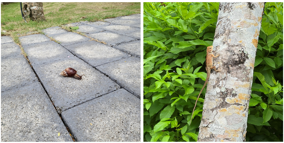 자연 친화적(?)인 리조트에는 달팽이와 도마뱀을 자주 볼 수 있는데요. 특히 저녁에 테라스에 나가면 도마뱀들이 벽에 돌아다니고 있는 모습을 볼 수 있습니다. 도마뱀을 귀여워하는 제 동생은 매우 좋아했어요. 아침 일찍 나가면 리조트에서 사는 듯한 큰 강아지도 2마리 있는데요. 사람에게는 전혀 관심이 없고 다가가면 도망가더라고요. 벌레에 물릴까봐 뿌리는 약을 많이 가져갔는데 모기에 한 방도 물리지 않아서 신기했는데 벌레는 없지만 다양한 동물들과 함께하는 시간이었어요. 😀
