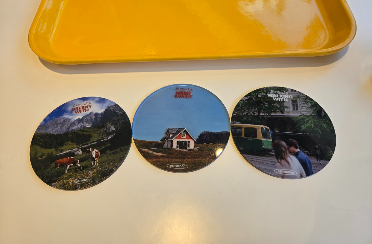 무엇보다 감성적인 컵받침이 인상적이었는데요, 엄마랑 몇 달 전 다녀온 웨스 앤더슨 전시가 생각나는 컵받침이라 기분 좋아지는 소품이었어요.