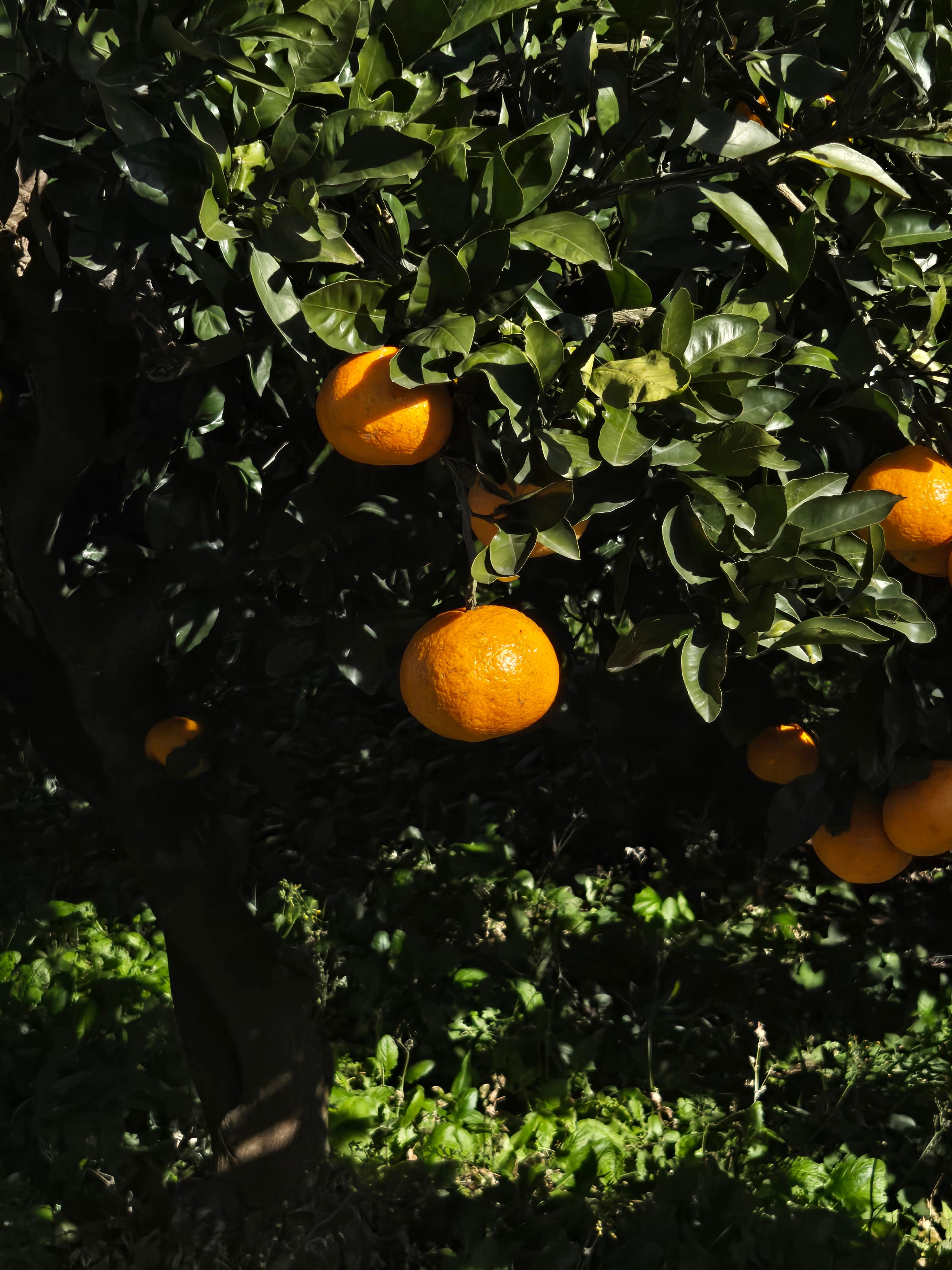 - 크리스마스 트리에 오너먼트처럼 주렁주렁 달린 귤나무의 귤
